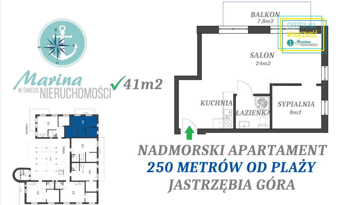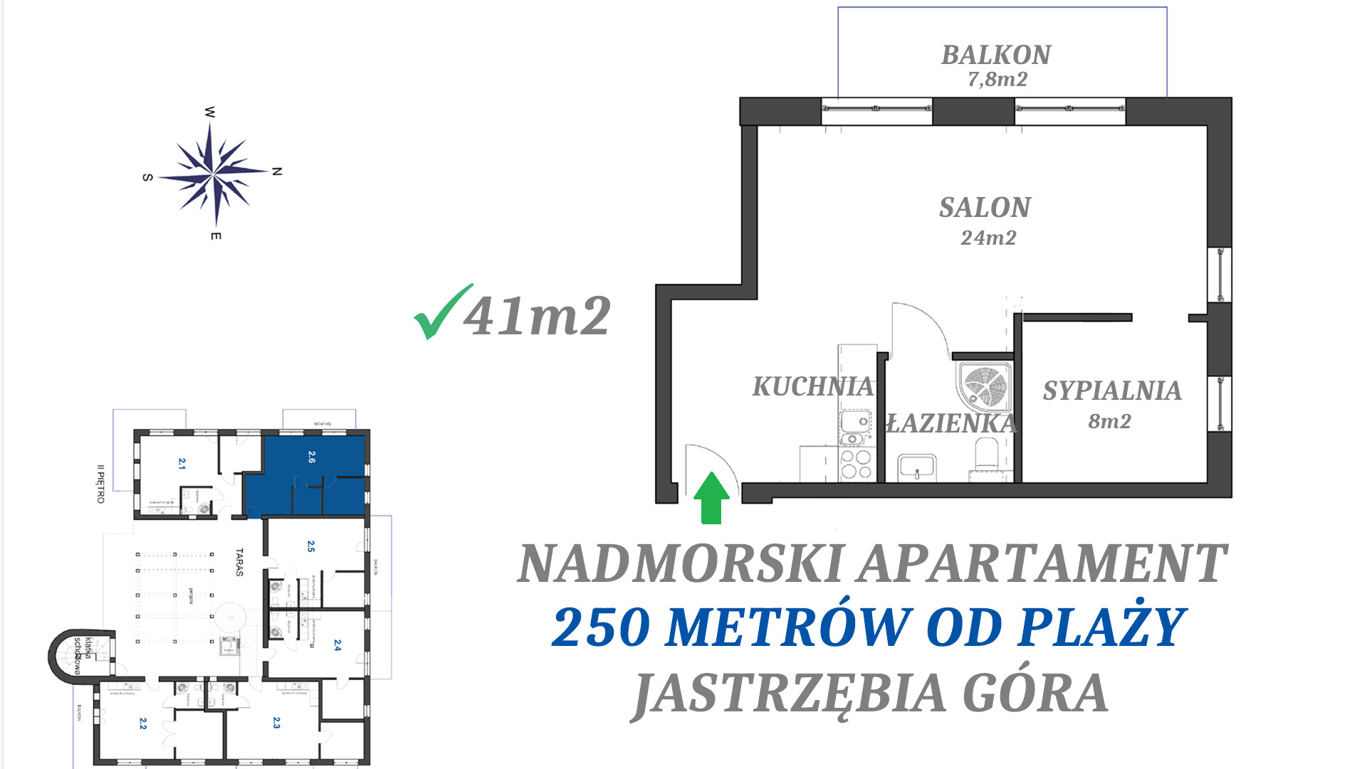 Apartament o powierzchni 40,8m2  znajduje się na drugim piętrze  i składa się z 24-metrowego salonu z otwartą kuchnią i wyjściem na balkon (7,8m2), sypialni, holu oraz  łazienki.