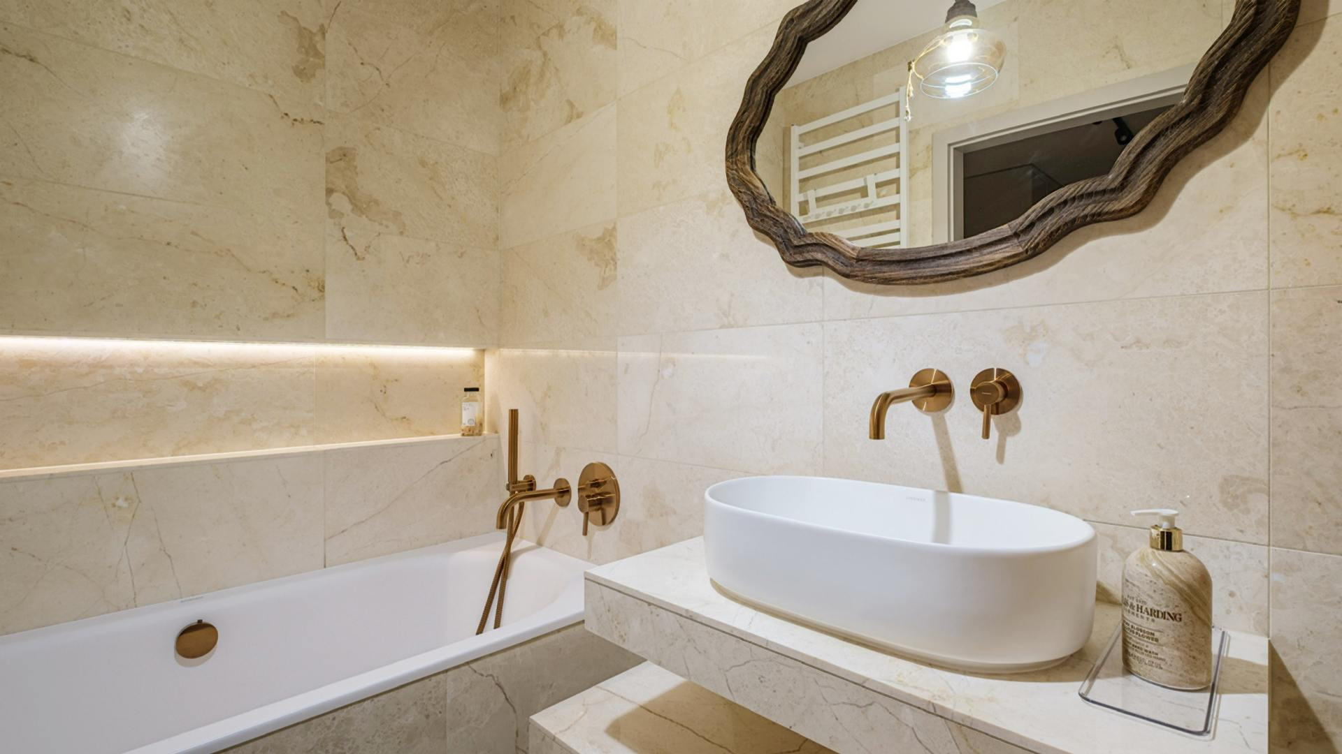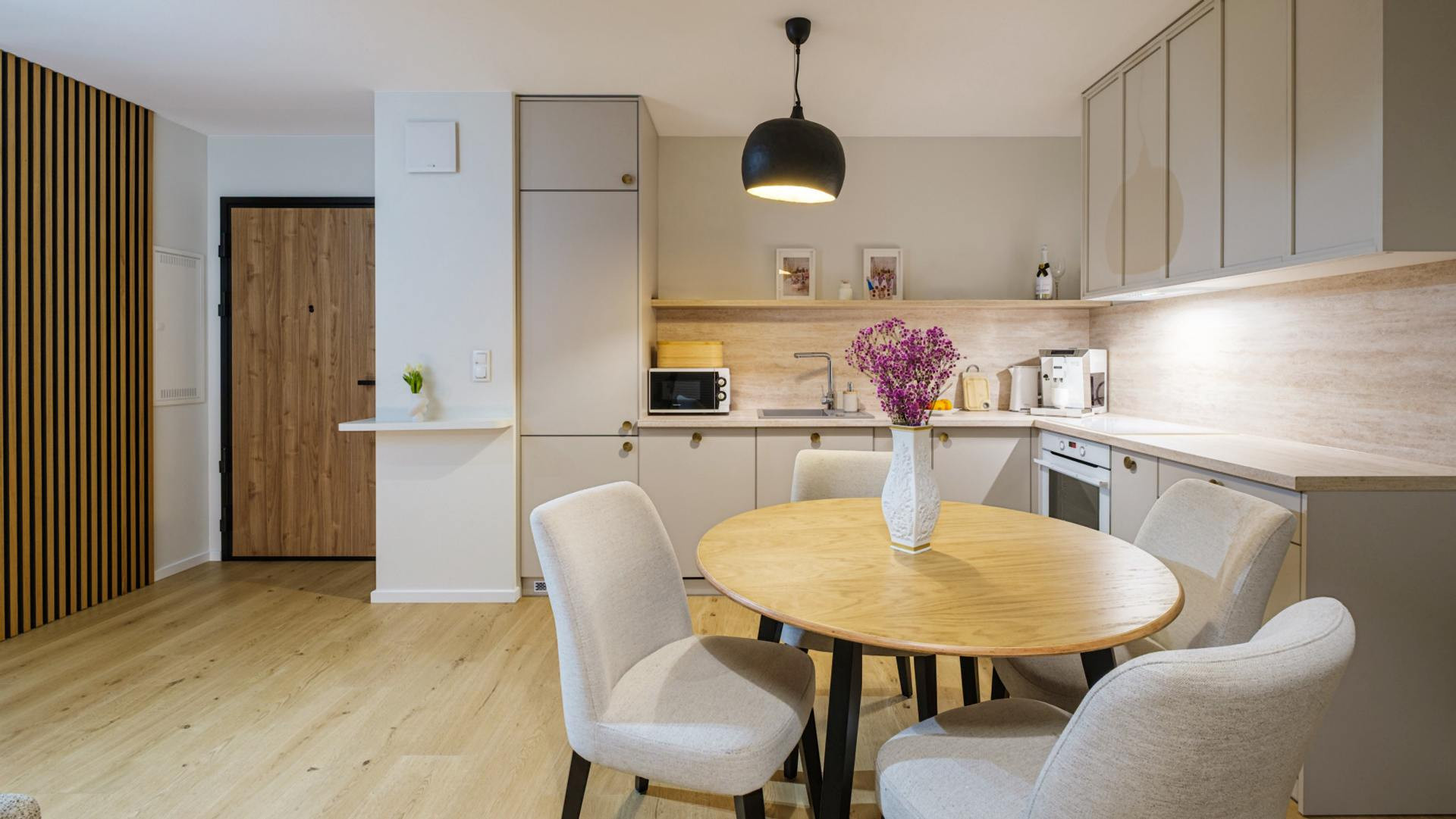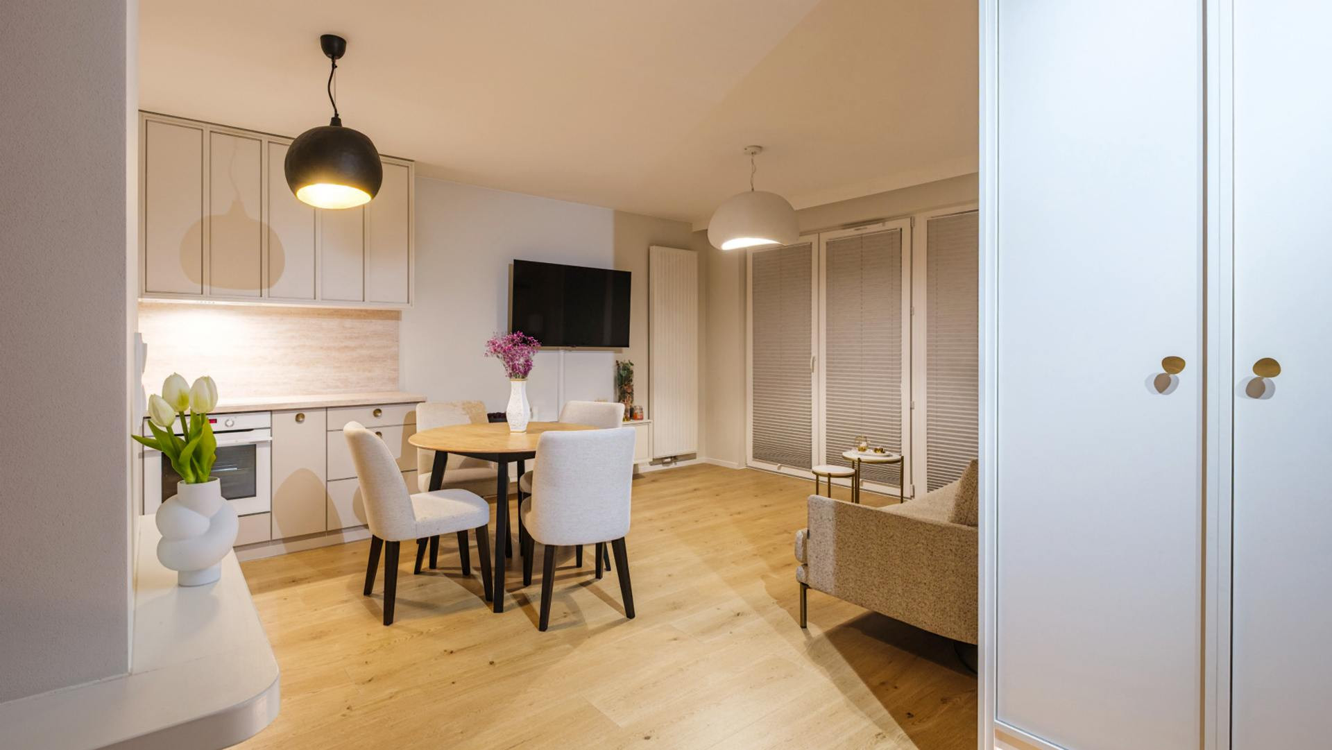 Wykończony w pastelowych ciepłych barwach z kaszmirowym odcieniem, apartament jest nowoczesny, gustowny i wygodny.