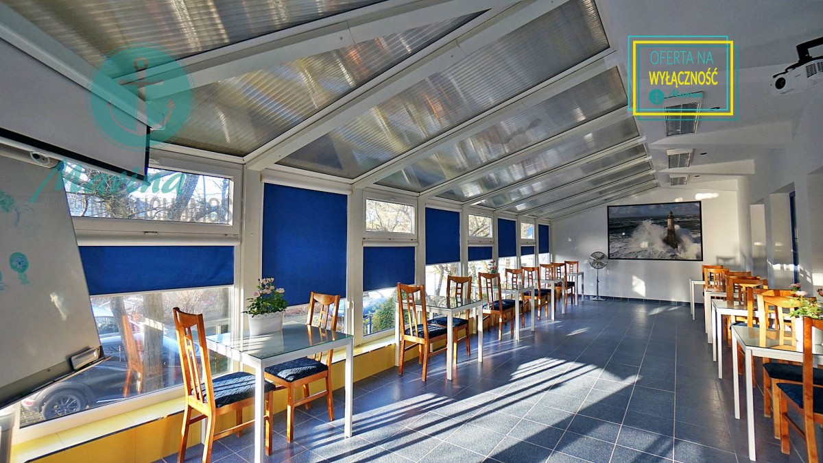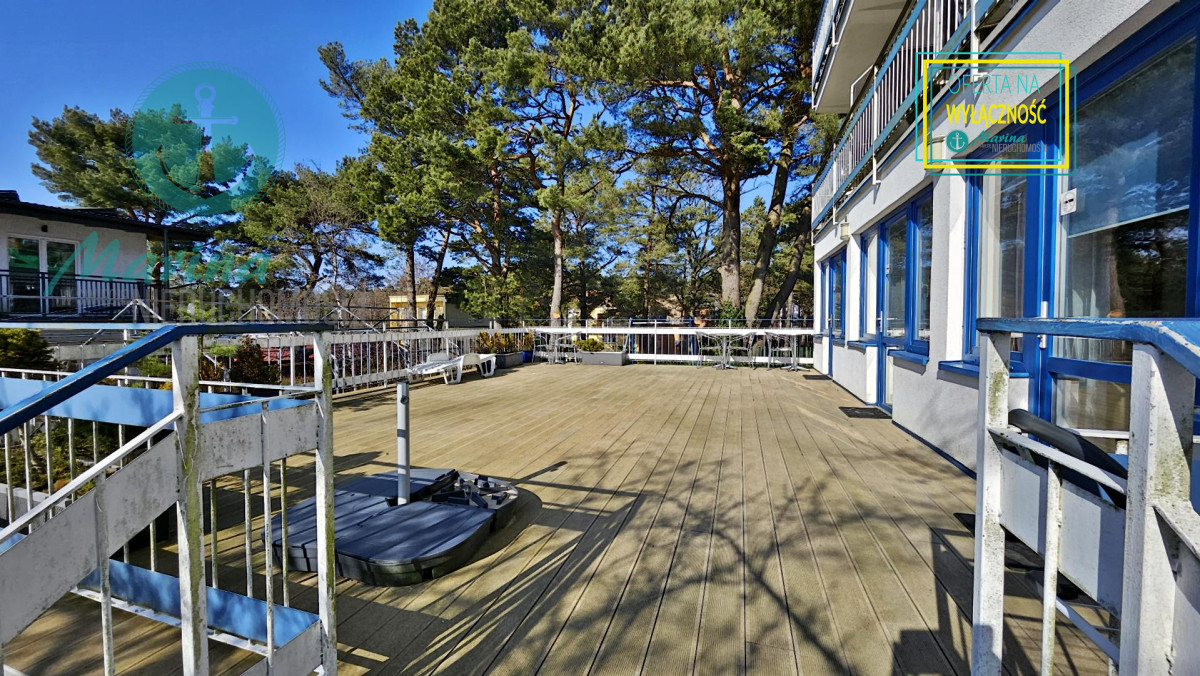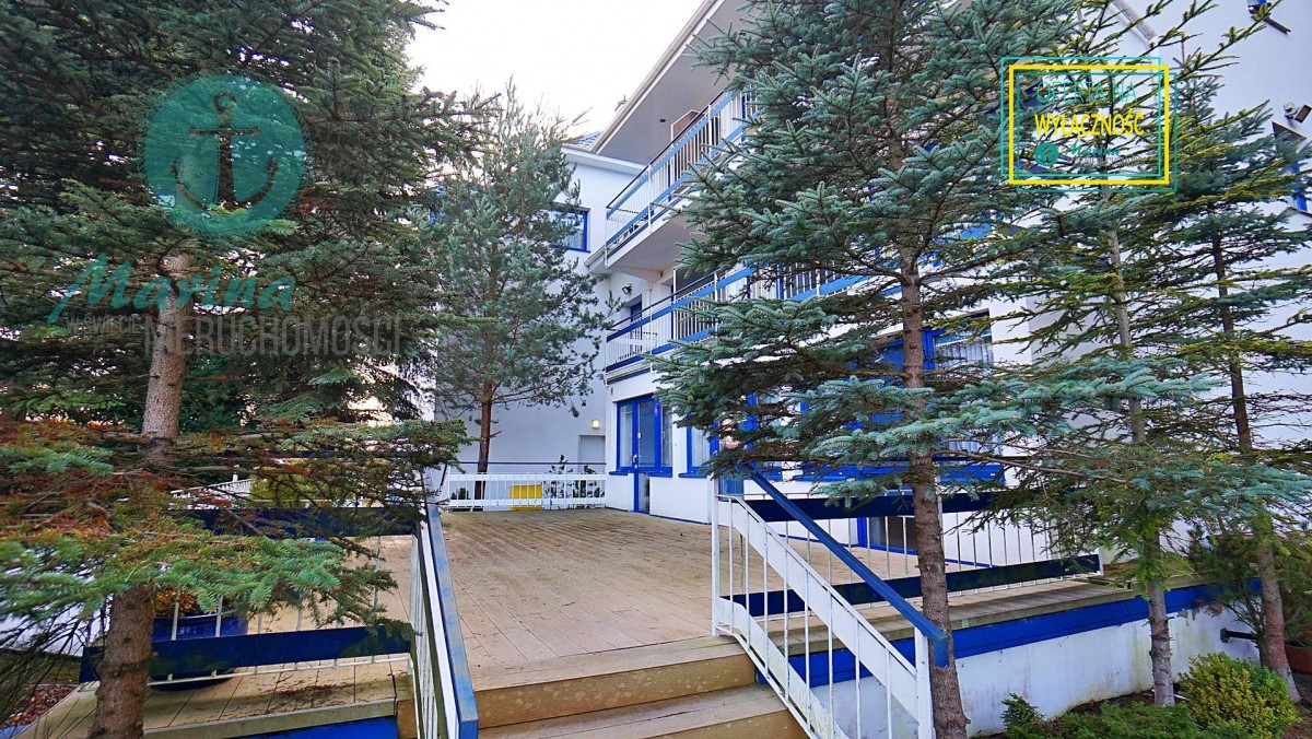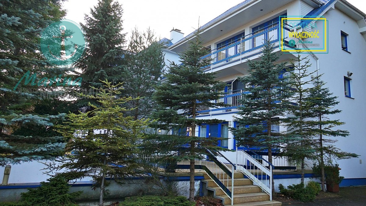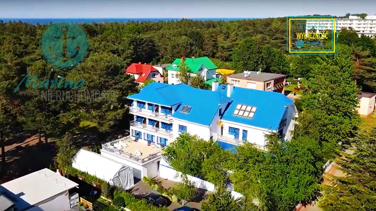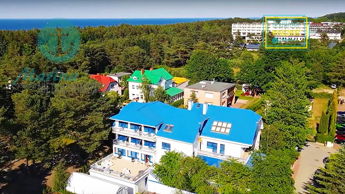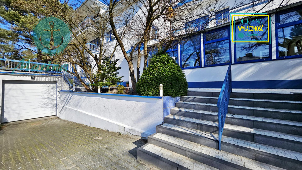 Charakterystyczna nadmorska architektura, biała bryła budynku pensjonatu z niebieskimi akcentami wykończenia detali o powierzchnia ok. 560m2, z kilkoma olbrzymimi tarasami (łącznie ok. 150m2), z dużym ogrodem zimowym i dwoma halami garażowymi, położonego na dużej 1195m2 działce, zanurzonej w zieleni, starodrzewiu i z szumem morza znajdującego się zaledwie 100 metrów dalej.