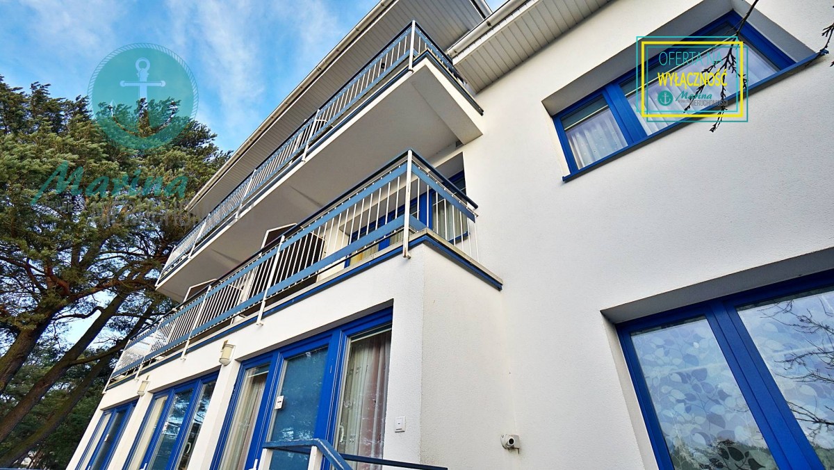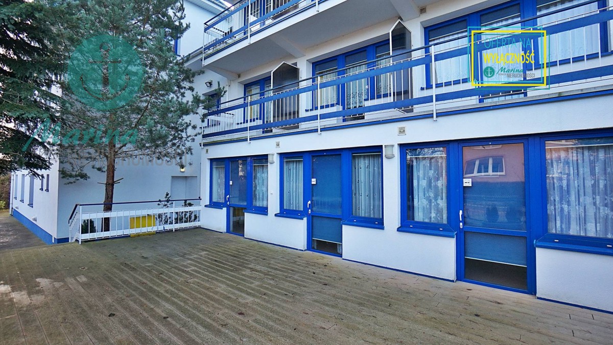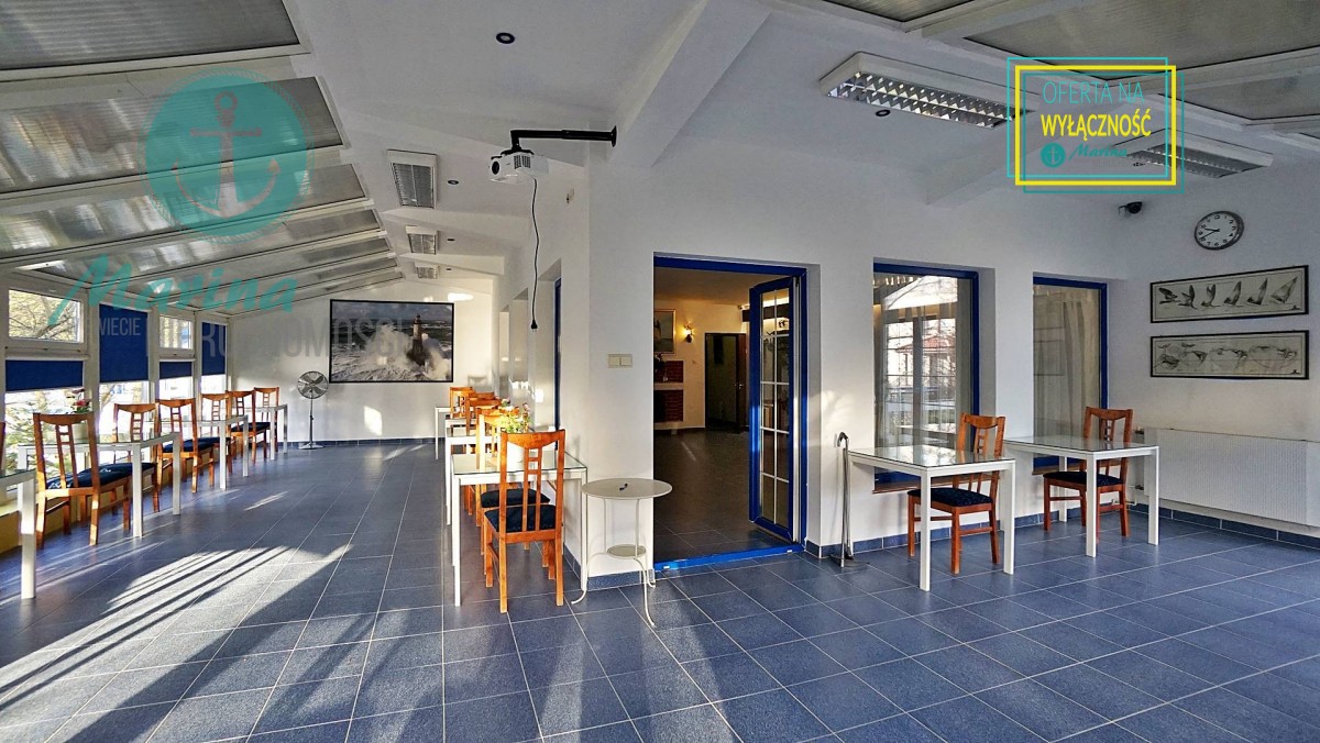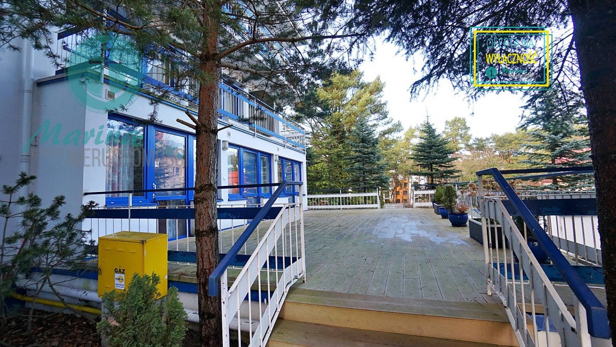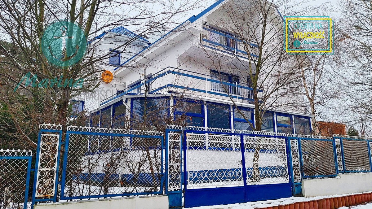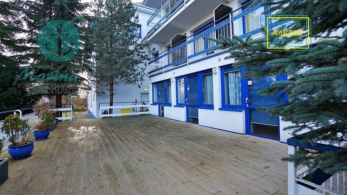 Charakterystyczna nadmorska architektura, biała bryła budynku pensjonatu z niebieskimi akcentami wykończenia detali o powierzchnia ok. 560m2, z kilkoma olbrzymimi tarasami (łącznie ok. 150m2), z dużym ogrodem zimowym i dwoma halami garażowymi, położonego na dużej 1195m2 działce, zanurzonej w zieleni, starodrzewiu i z szumem morza znajdującego się zaledwie 100 metrów dalej.
