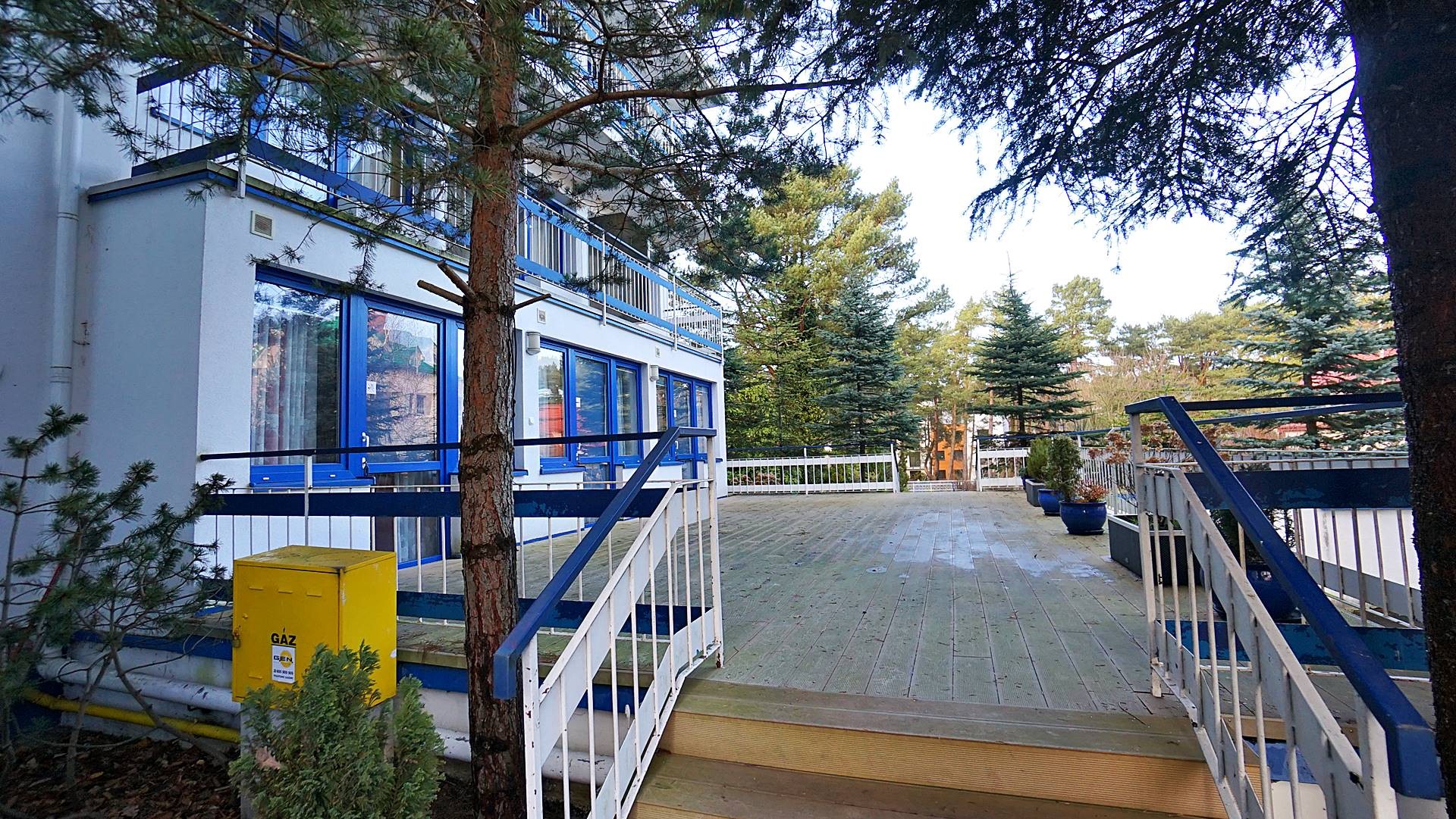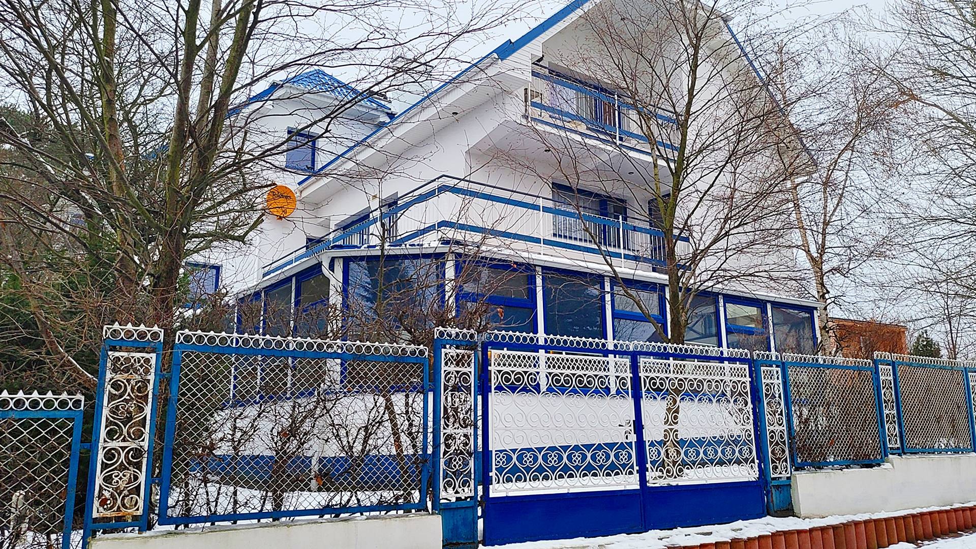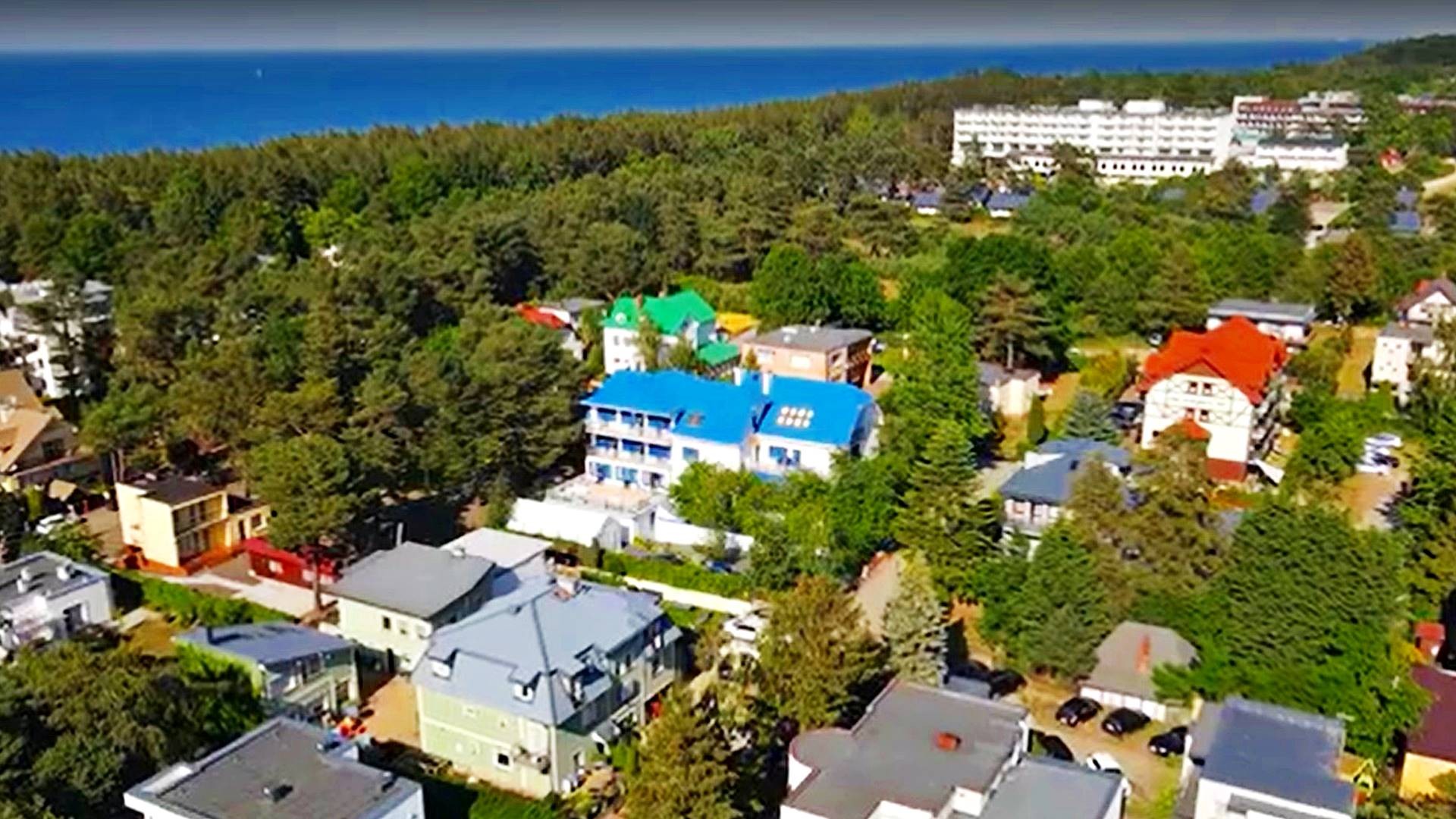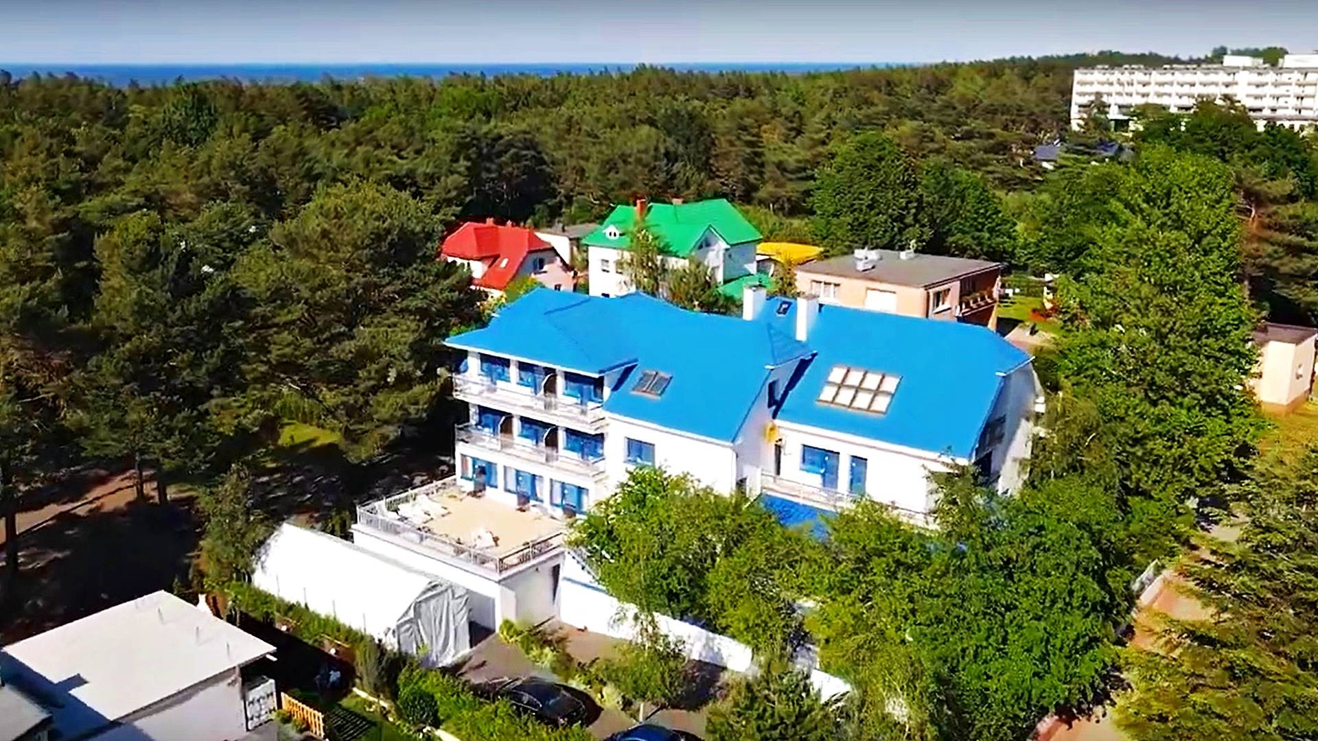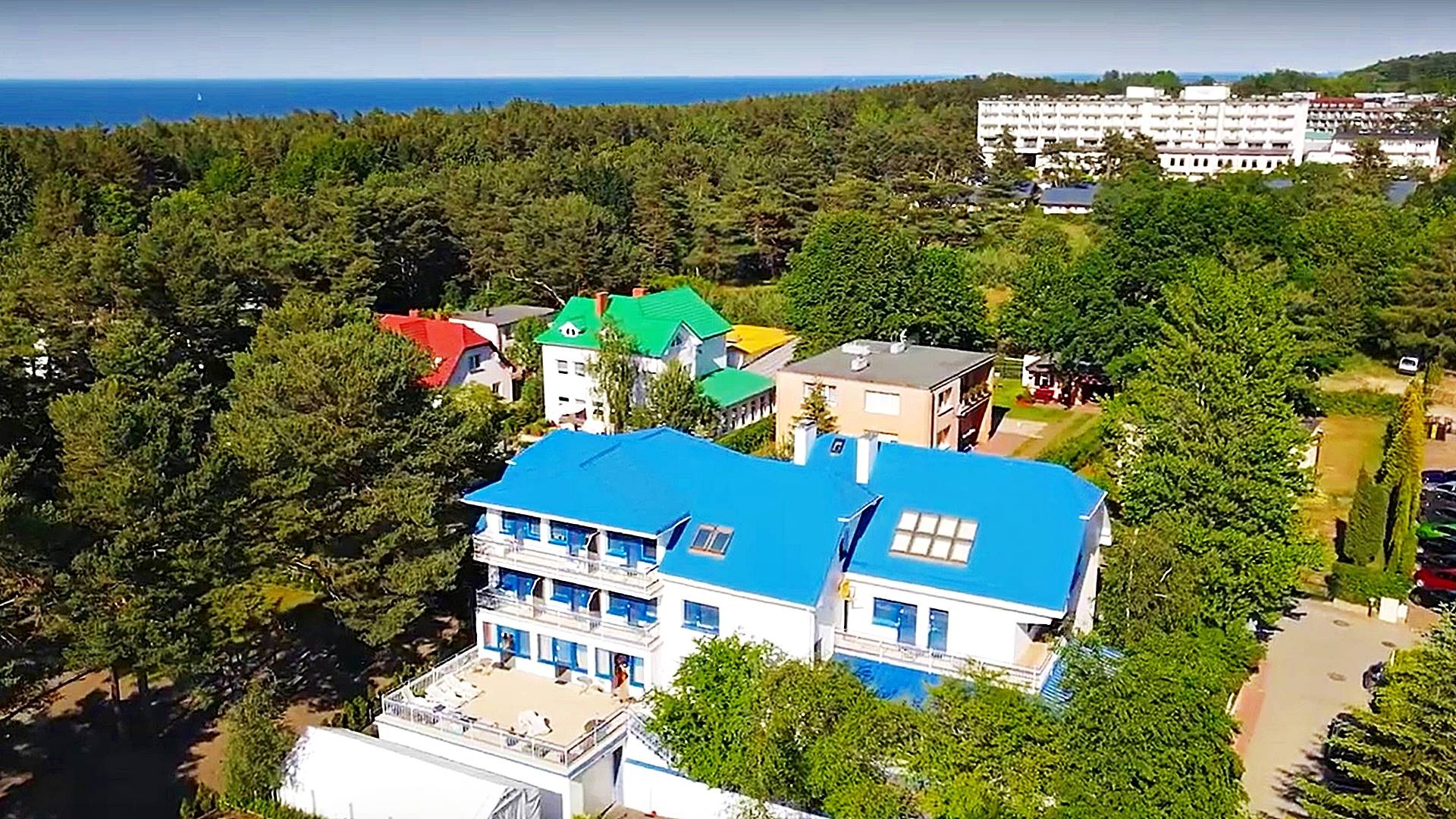Charakterystyczna nadmorska architektura, biała bryła budynku pensjonatu z niebieskimi akcentami wykończenia detali o powierzchnia ok. 560m2, z kilkoma olbrzymimi tarasami (łącznie ok. 150m2), z dużym ogrodem zimowym i dwoma halami garażowymi, położonego na dużej 1195m2 działce, zanurzonej w zieleni, starodrzewiu i z szumem morza znajdującego się zaledwie 100 metrów dalej.