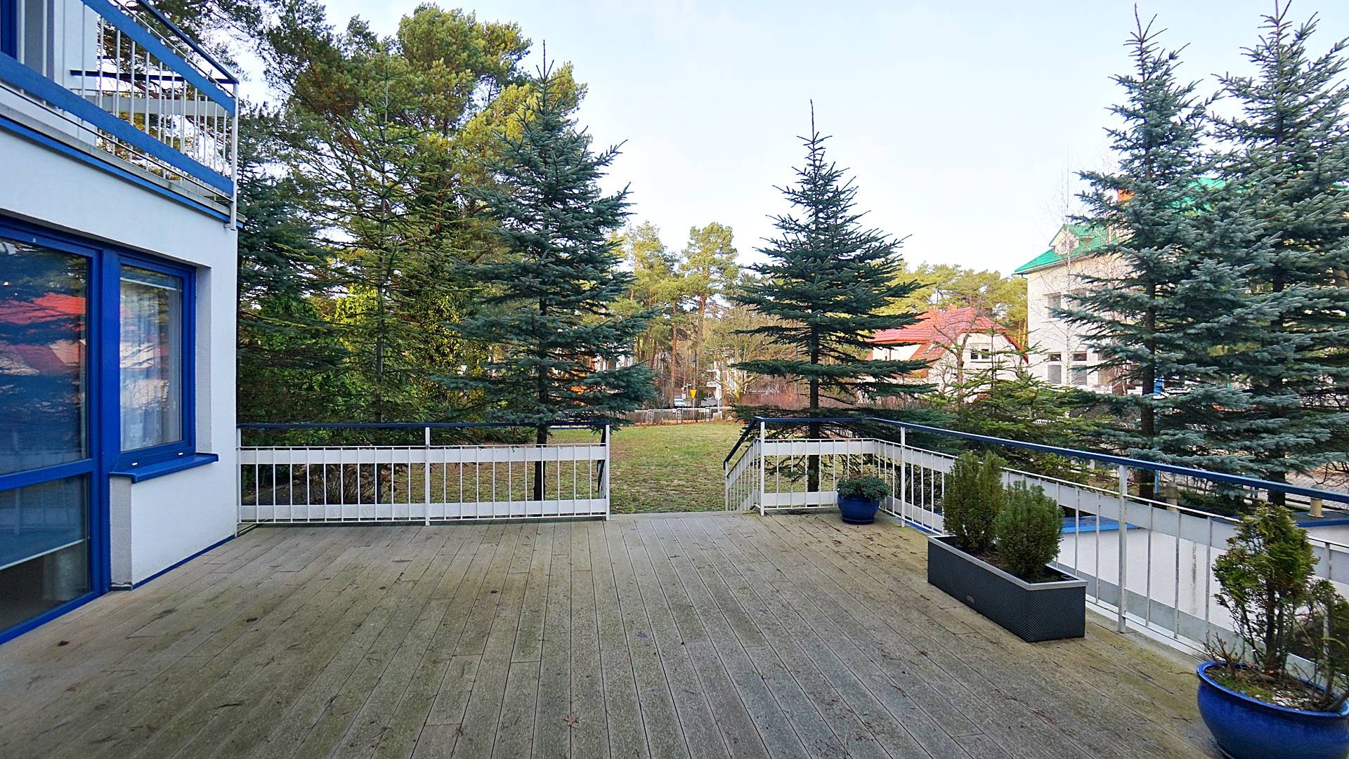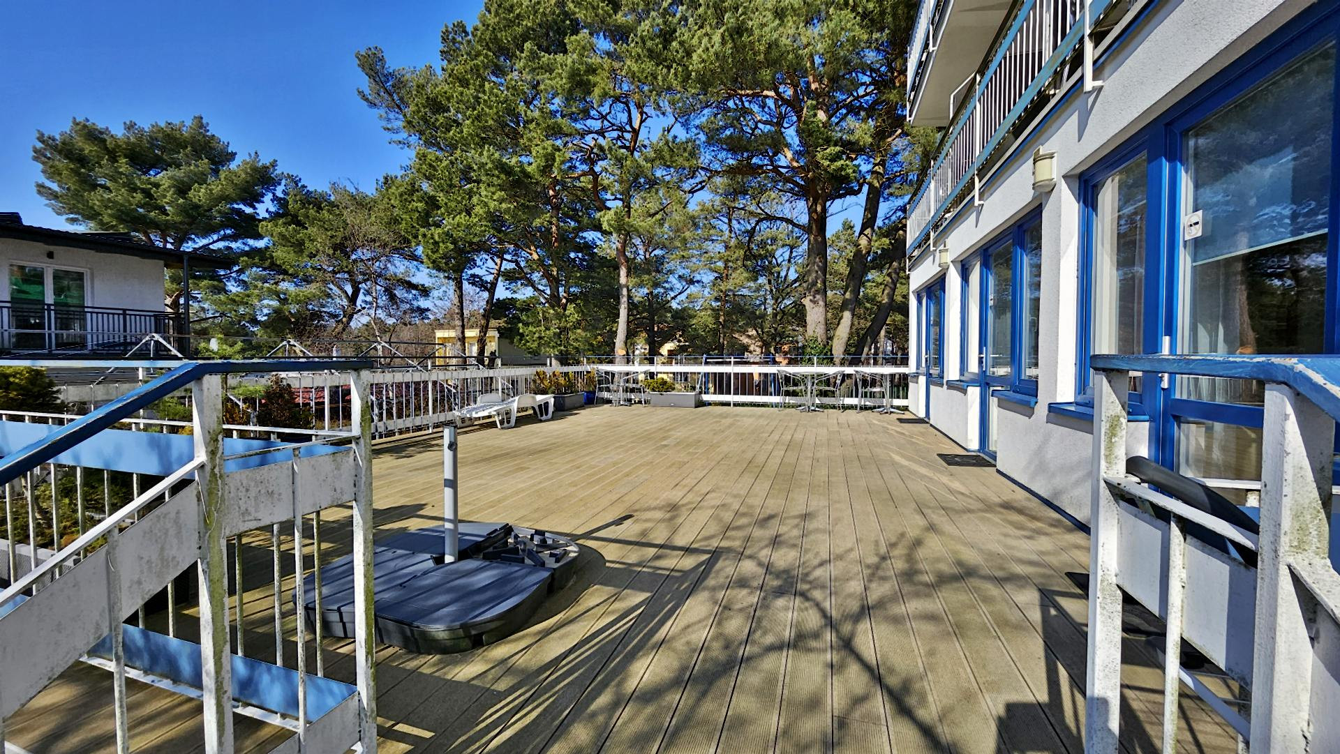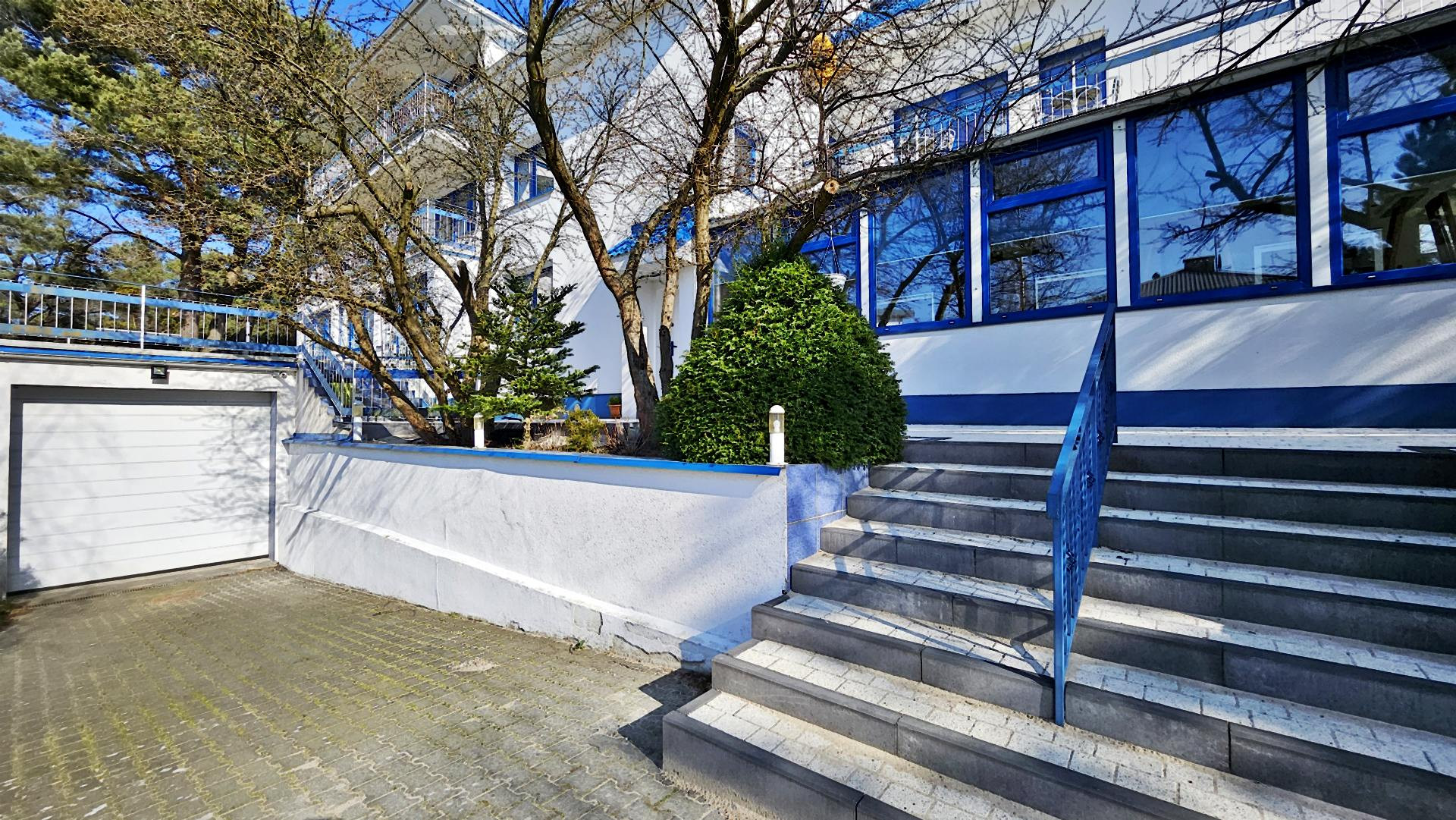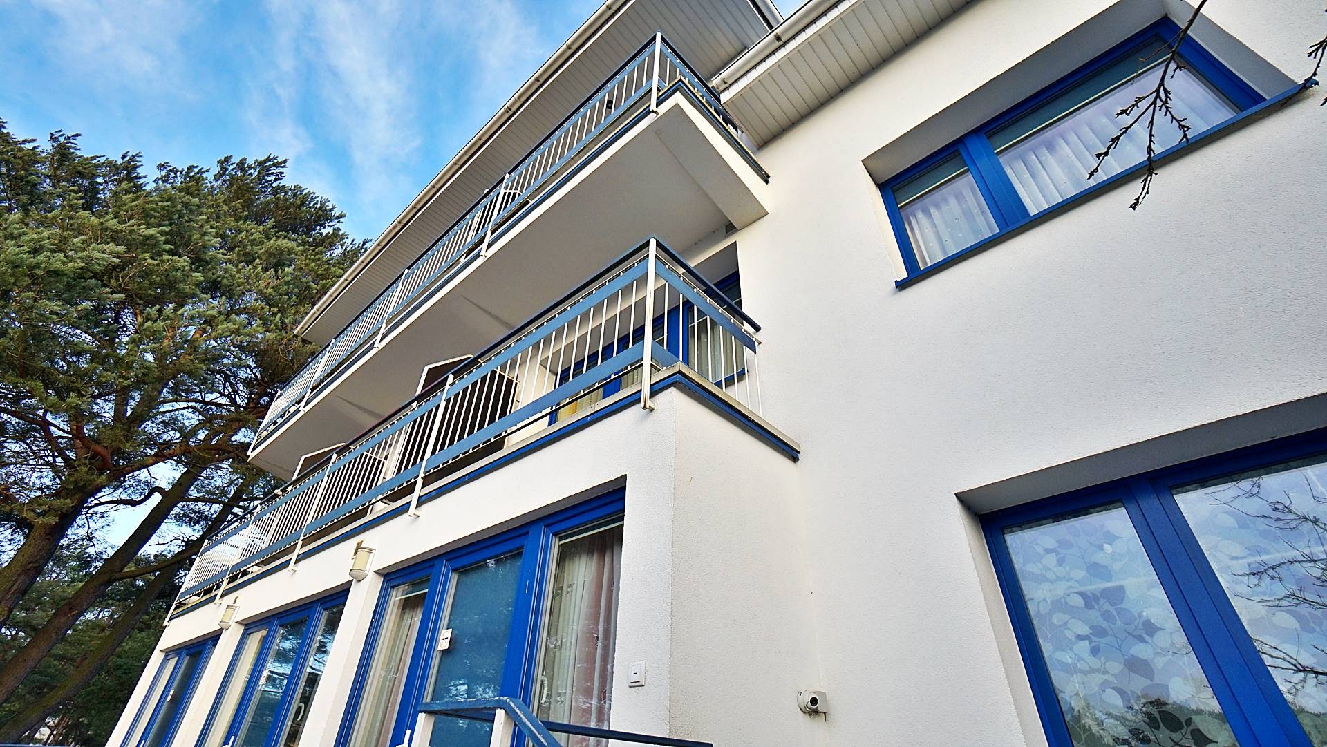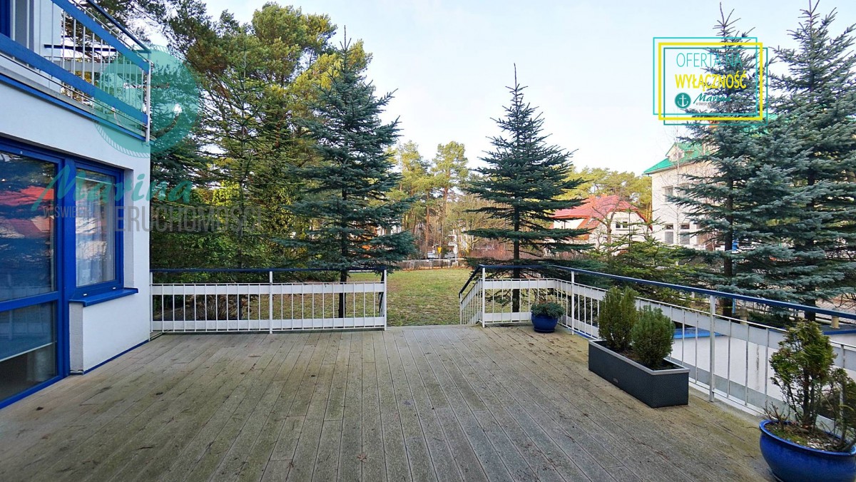 Charakterystyczna nadmorska architektura, biała bryła budynku pensjonatu z niebieskimi akcentami wykończenia detali o powierzchnia ok. 560m2, z kilkoma olbrzymimi tarasami (łącznie ok. 150m2), z dużym ogrodem zimowym i dwoma halami garażowymi, położonego na dużej 1195m2 działce, zanurzonej w zieleni, starodrzewiu i z szumem morza znajdującego się zaledwie 100 metrów dalej.