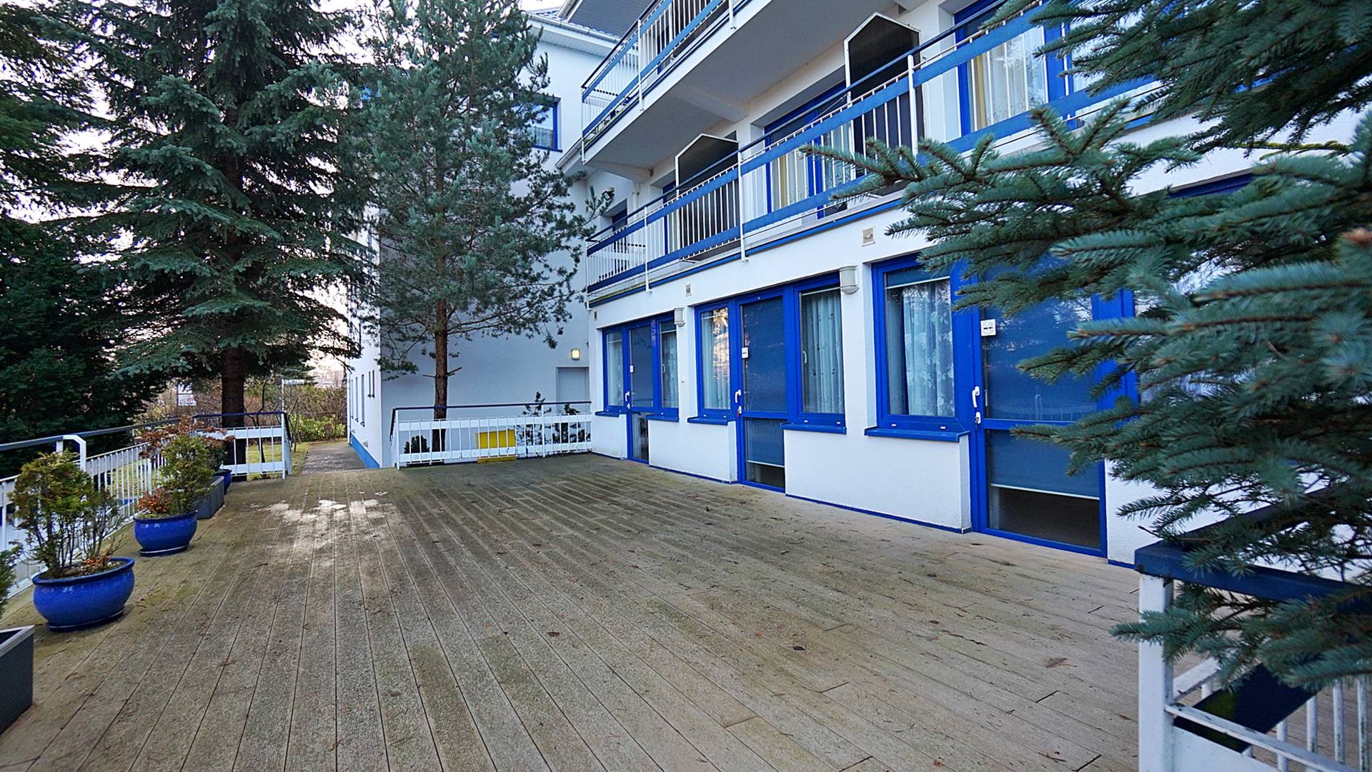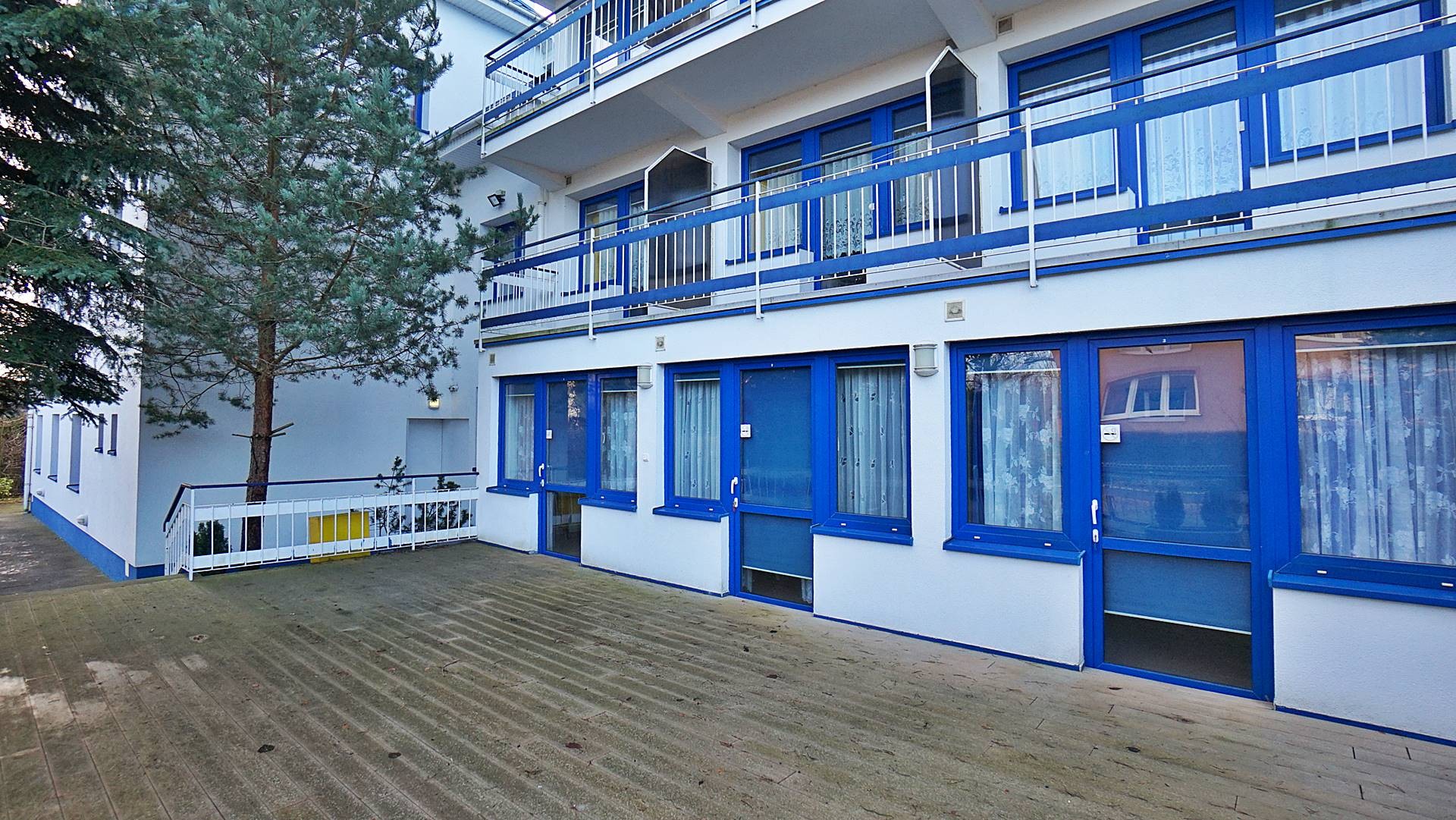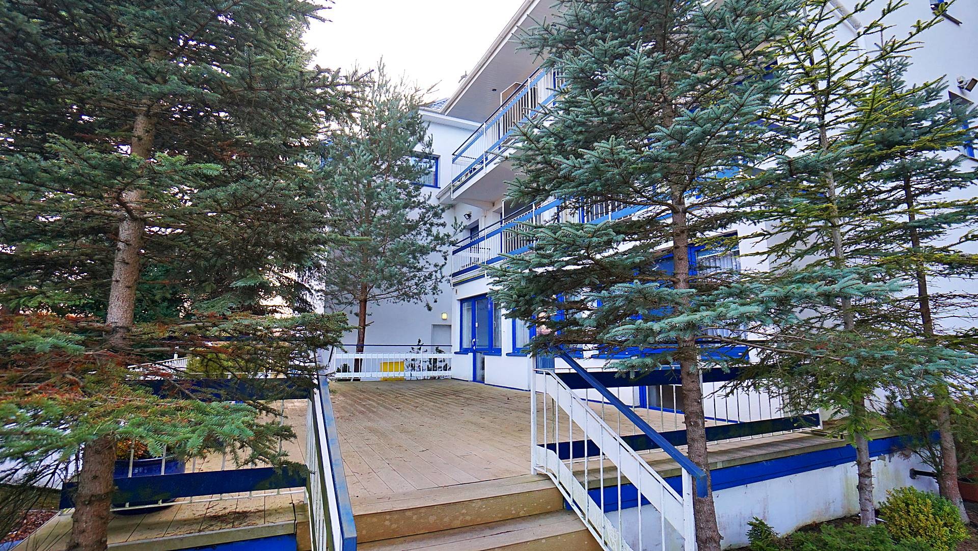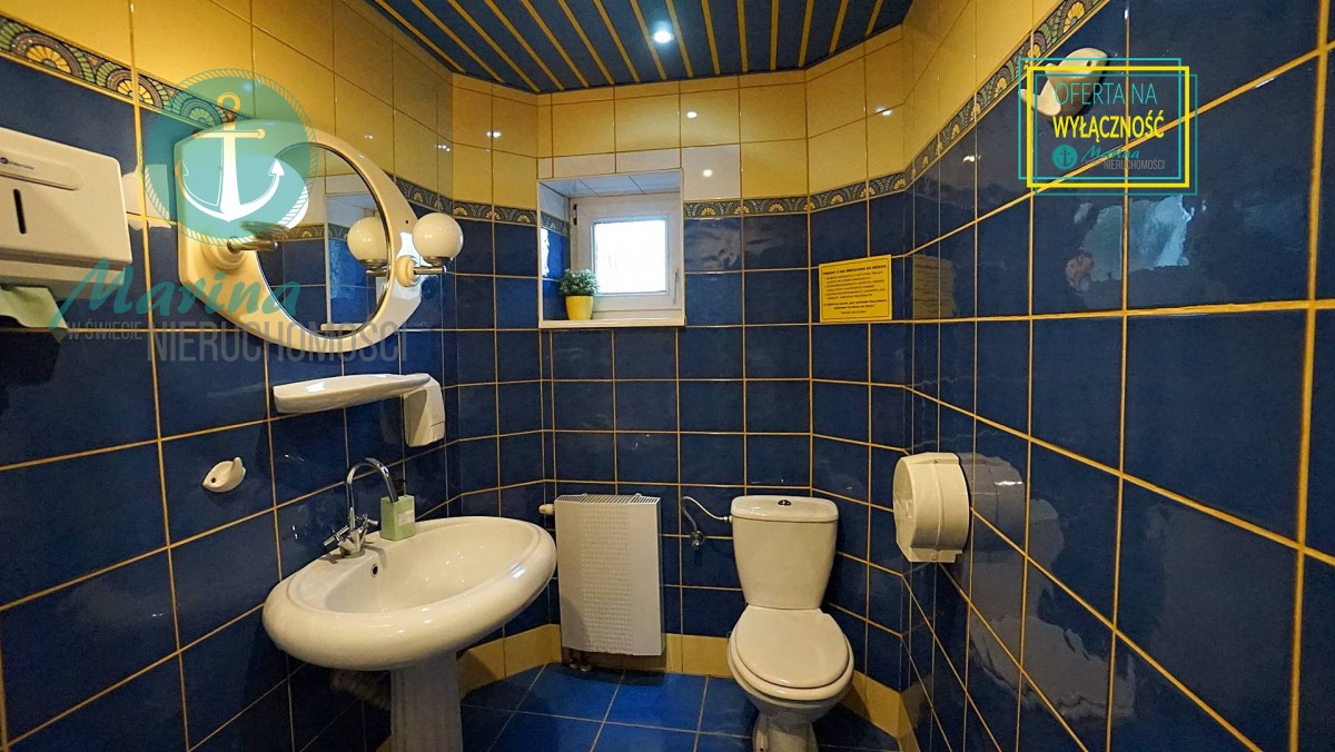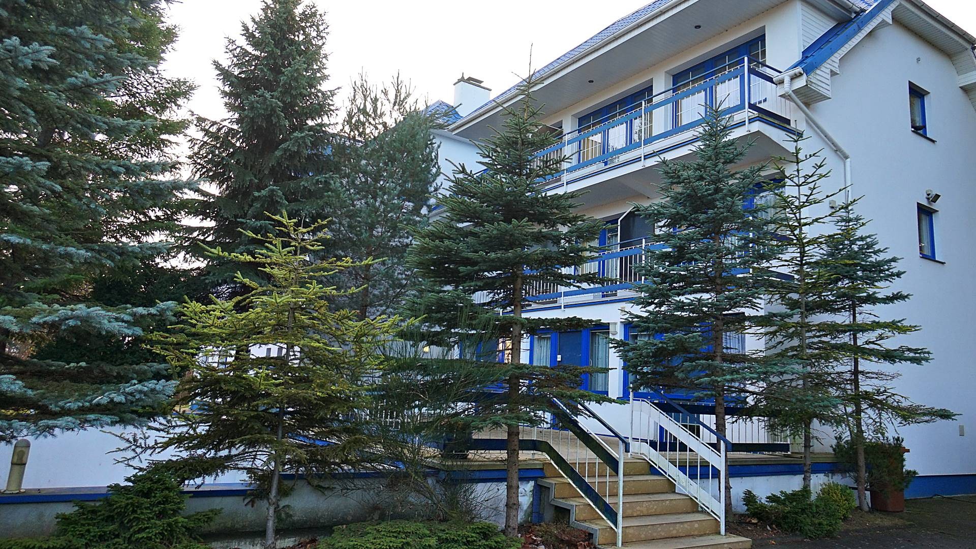 Charakterystyczna nadmorska architektura, biała bryła budynku pensjonatu z niebieskimi akcentami wykończenia detali o powierzchnia ok. 560m2, z kilkoma olbrzymimi tarasami (łącznie ok. 150m2), z dużym ogrodem zimowym i dwoma halami garażowymi, położonego na dużej 1195m2 działce, zanurzonej w zieleni, starodrzewiu i z szumem morza znajdującego się zaledwie 100 metrów dalej.