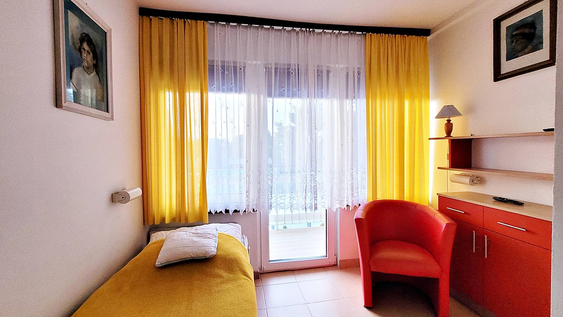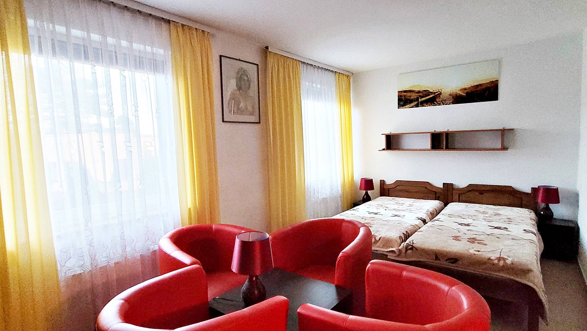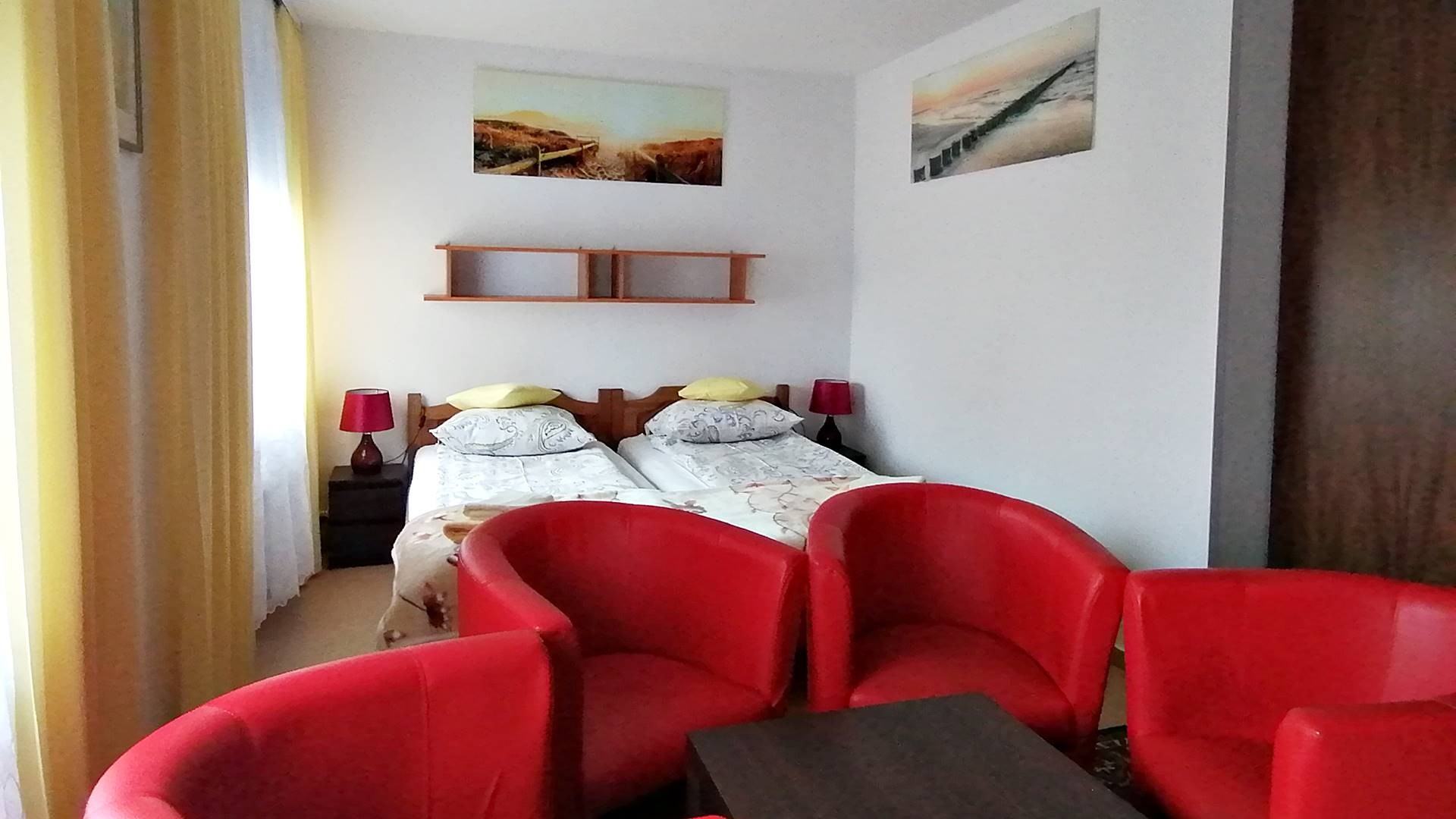 3 pokoje 2-3 osobowe z łazienkami z wejściem bezpośrednio z tarasu, 1 pokój 4-osobowyz łazienką , 7 pokoi 1- osobowych z łazienkami, 1 pokój 2-osobowy z łazienką