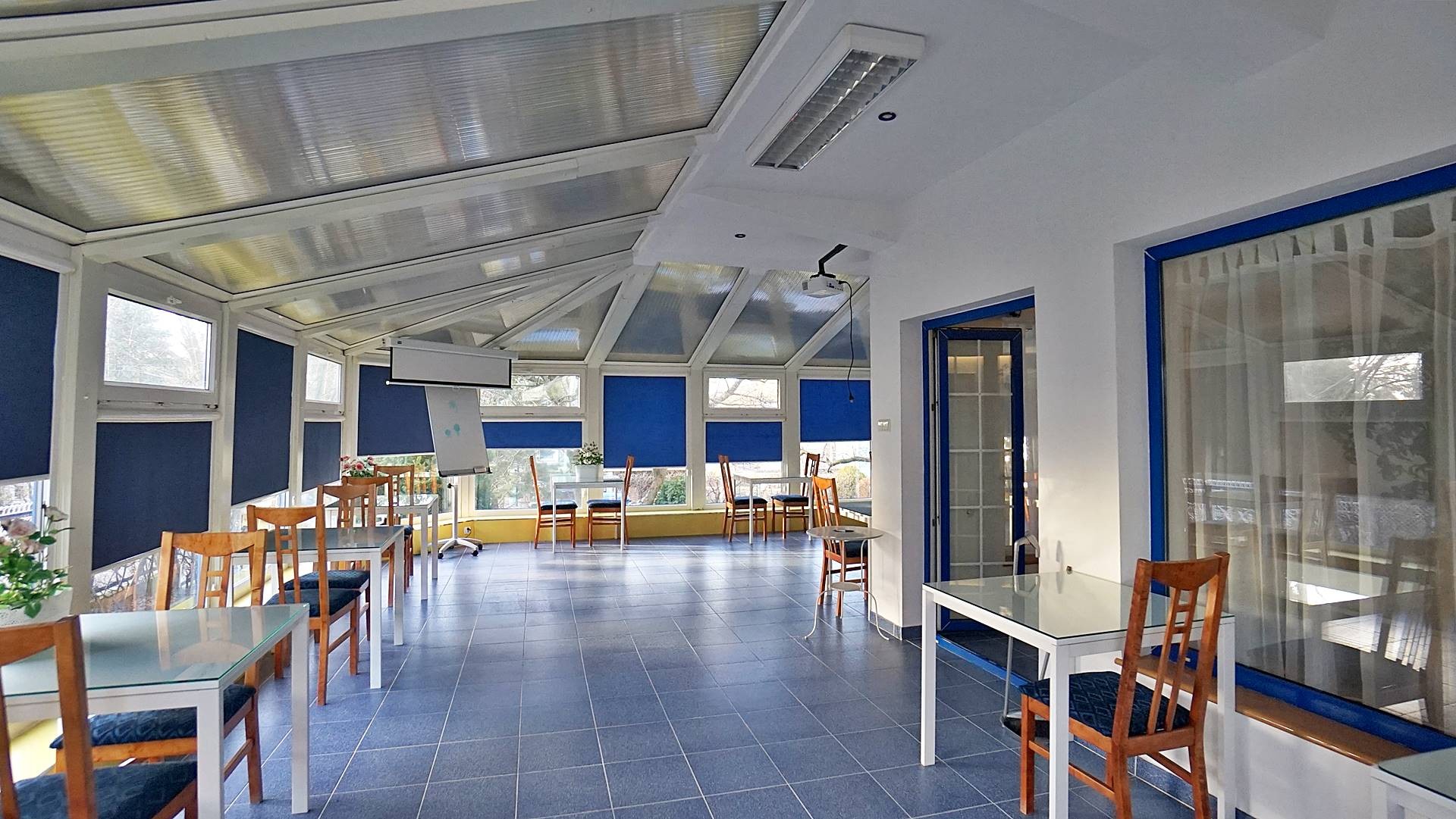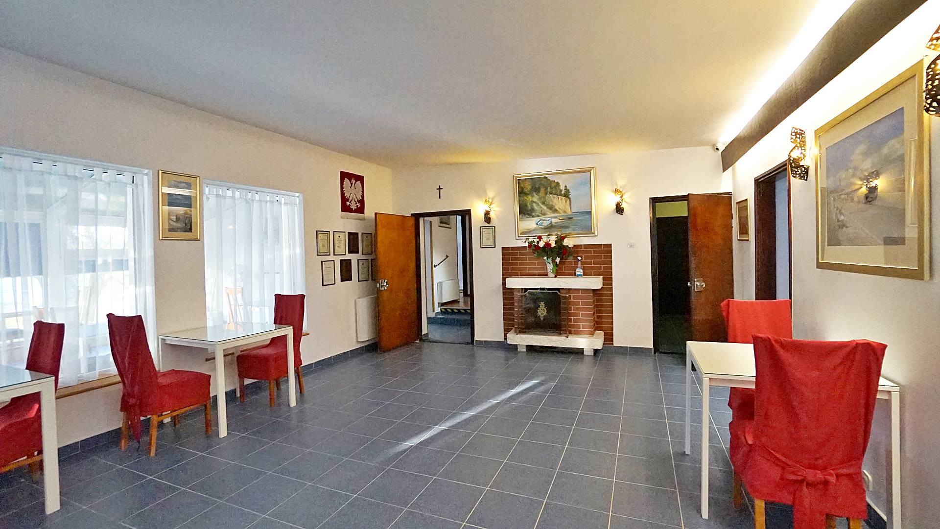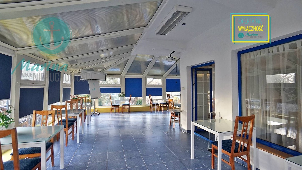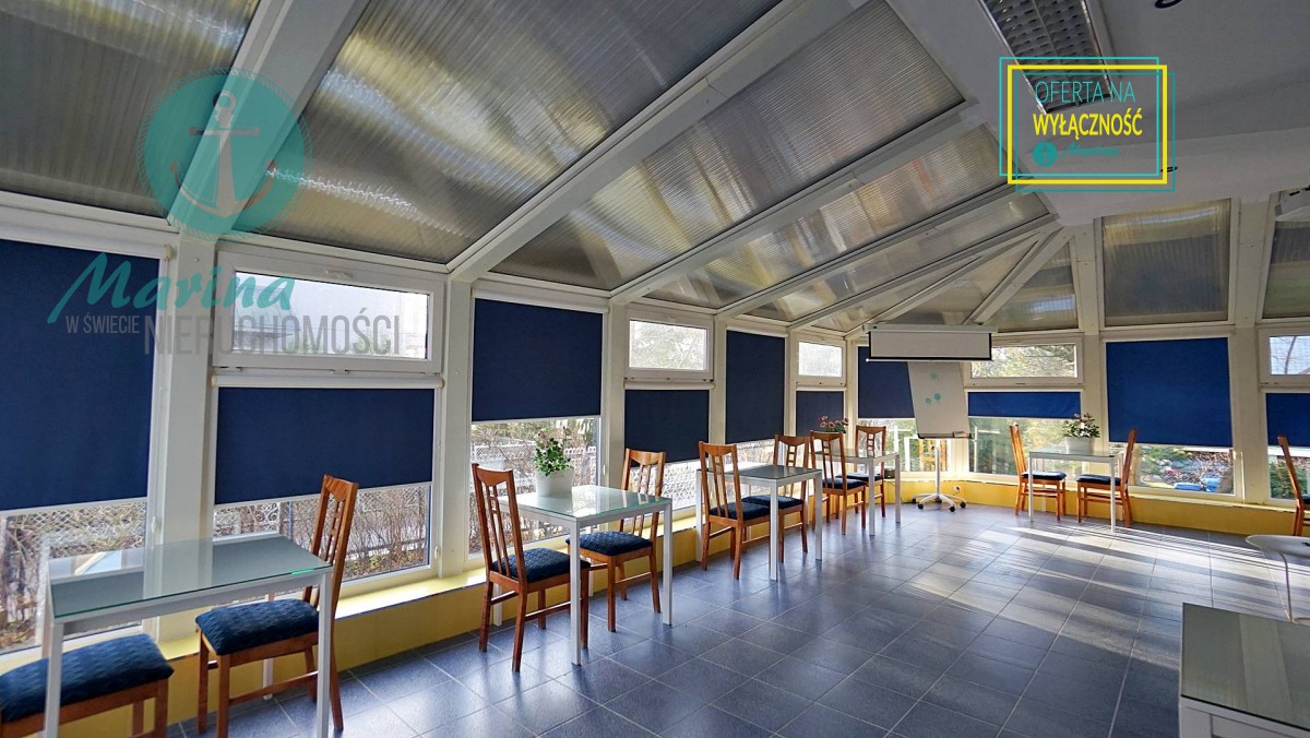 Duża jadalnia (kilka sal) położona częściowo w bryle budynku (sala kominkowa) a częściowo w uroczym ogrodzie zimowym z bezpośrednim wyjściem do ogrodu, dwa duże tarasy 60m2 i 70 m2 , z których wchodzi się bezpośrednio do sześciu 2-3 osobowych pokoi z łazienkami, dwa gabinety każdy z własnym węzłem sanitarnym z możliwością zmiany aranżacji na dwa pokoje z łazienkami (do tej pory pensjonat funkcjonował jako ośrodek wczasów odchudzających), aneks kuchenny, dwie toalety, hol wejściowy