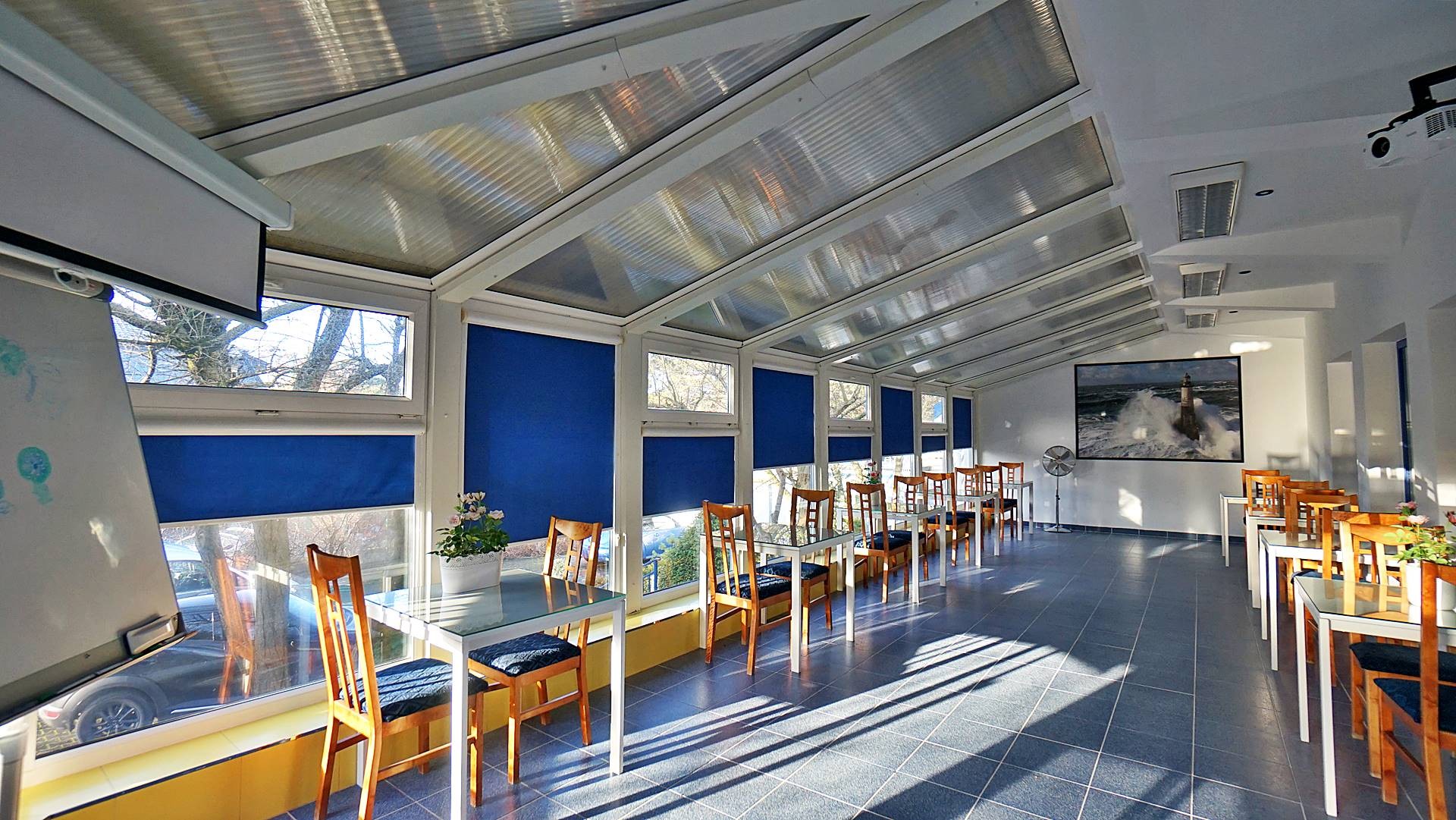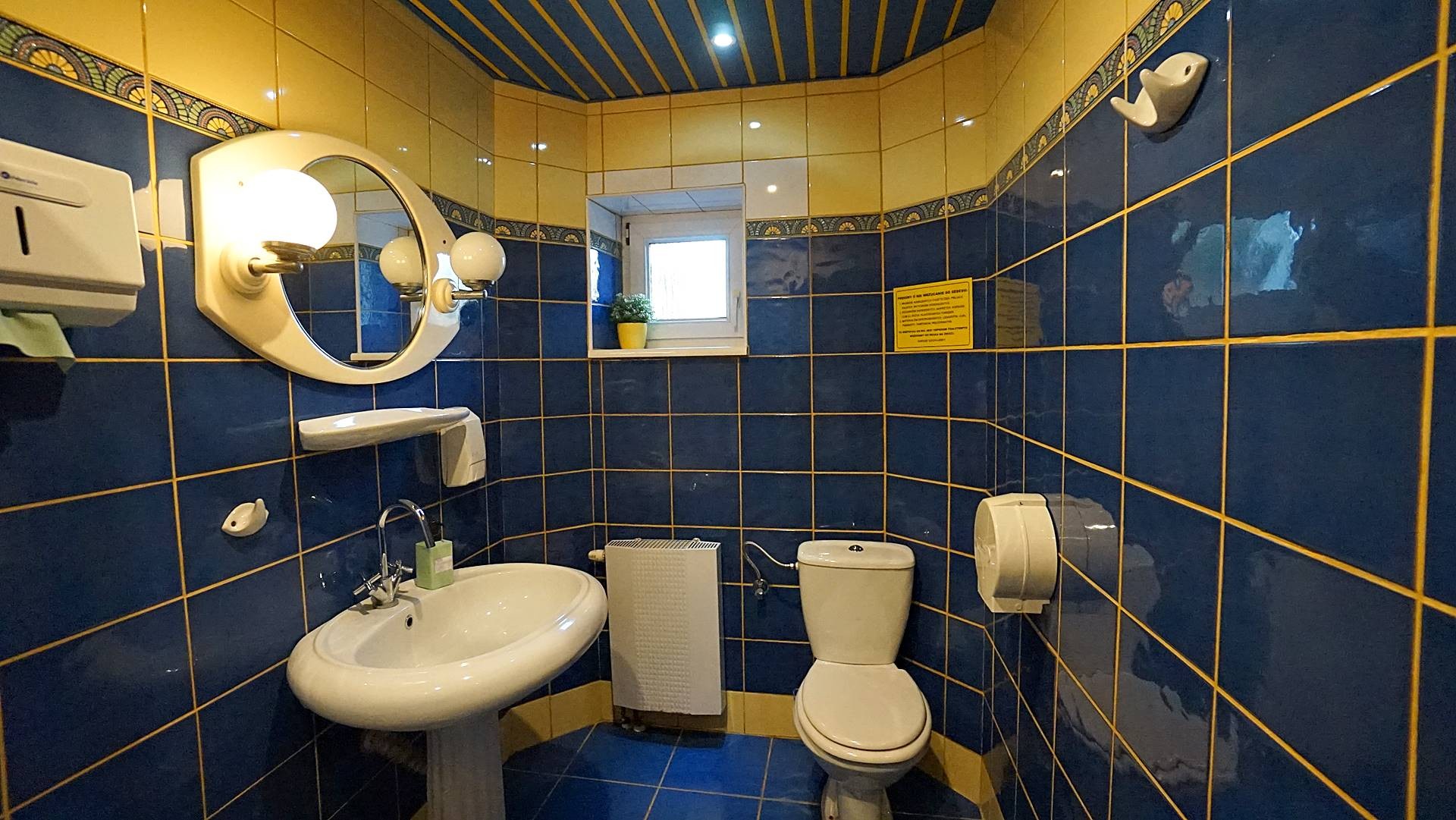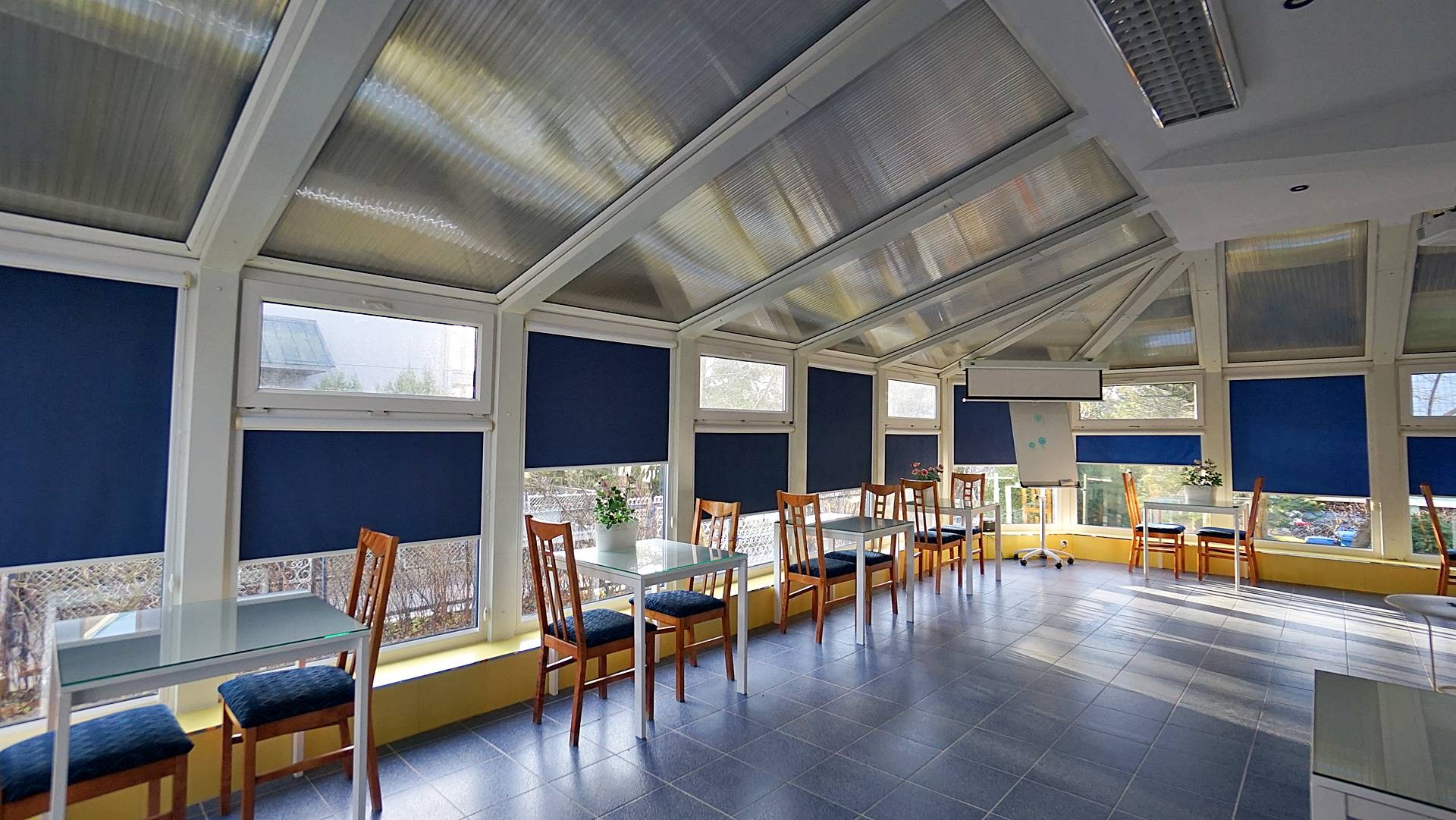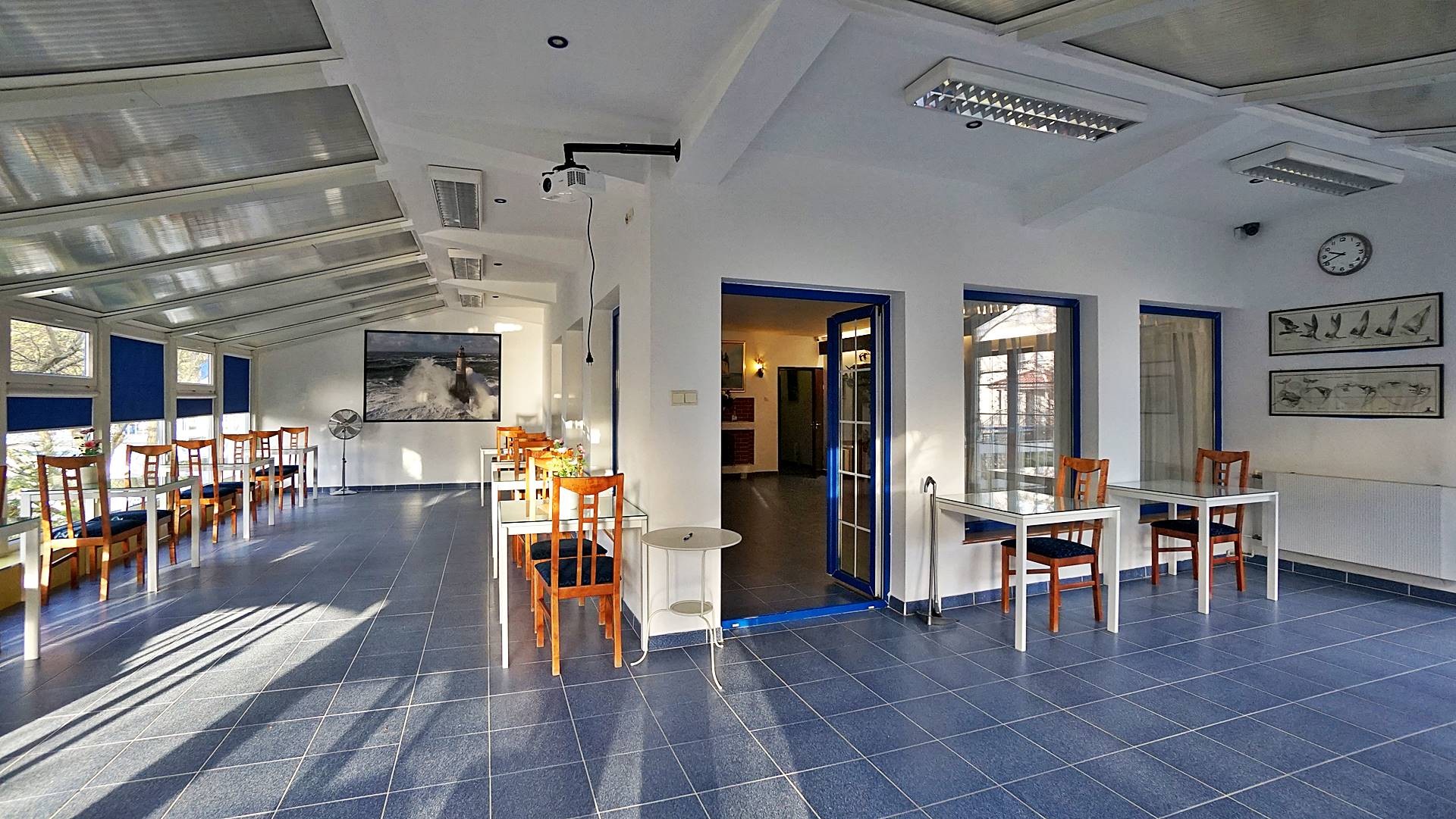Duża jadalnia (kilka sal) położona częściowo w bryle budynku (sala kominkowa) a częściowo w uroczym ogrodzie zimowym z bezpośrednim wyjściem do ogrodu, dwa duże tarasy 60m2 i 70 m2 , z których wchodzi się bezpośrednio do sześciu 2-3 osobowych pokoi z łazienkami, dwa gabinety każdy z własnym węzłem sanitarnym z możliwością zmiany aranżacji na dwa pokoje z łazienkami (do tej pory pensjonat funkcjonował jako ośrodek wczasów odchudzających), aneks kuchenny, dwie toalety, hol wejściowy