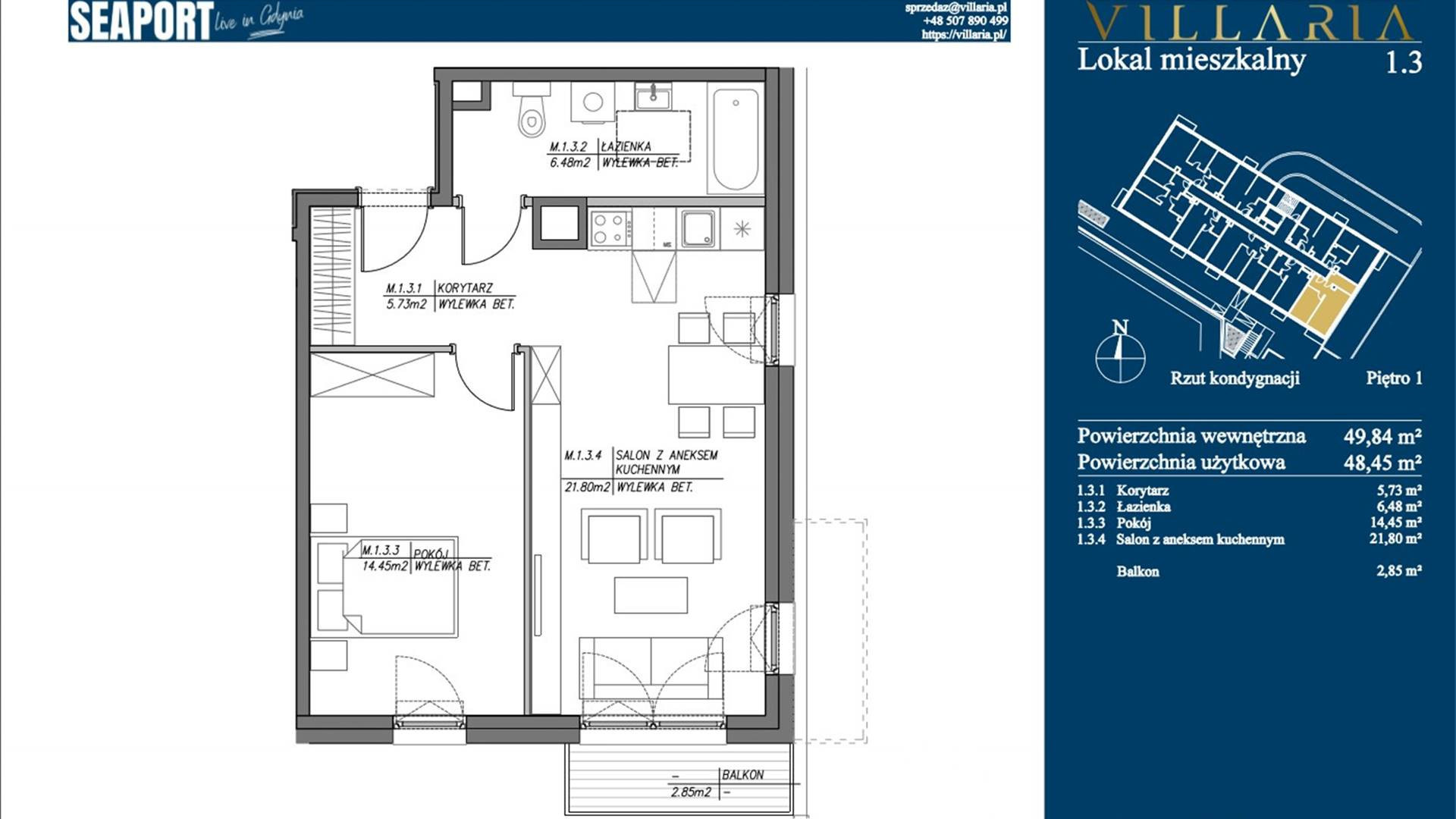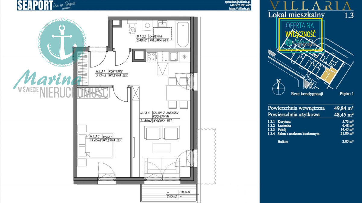 2-pokojowe mieszkanie o powierzchni 49m2 znajduje się na pierwszym piętrze w 4-piętrowym nowym apartamentowcu z windą SEAPORT w Gdyni, u zbiegu trzech dzielnic Grabówka, Śródmieścia i Działek Leśnych.